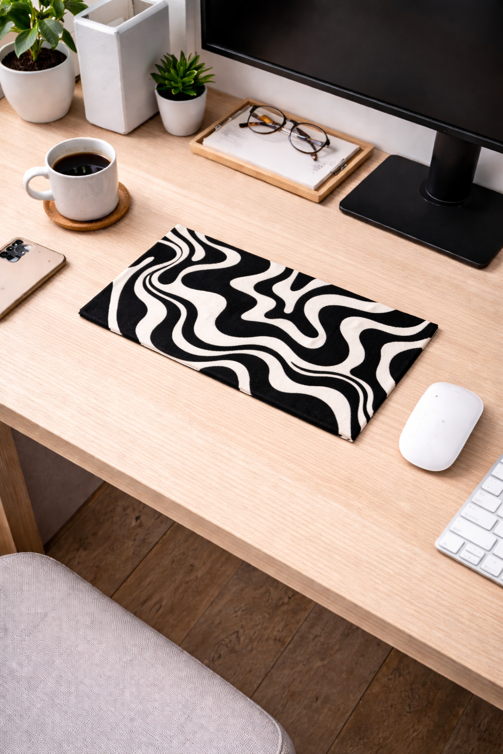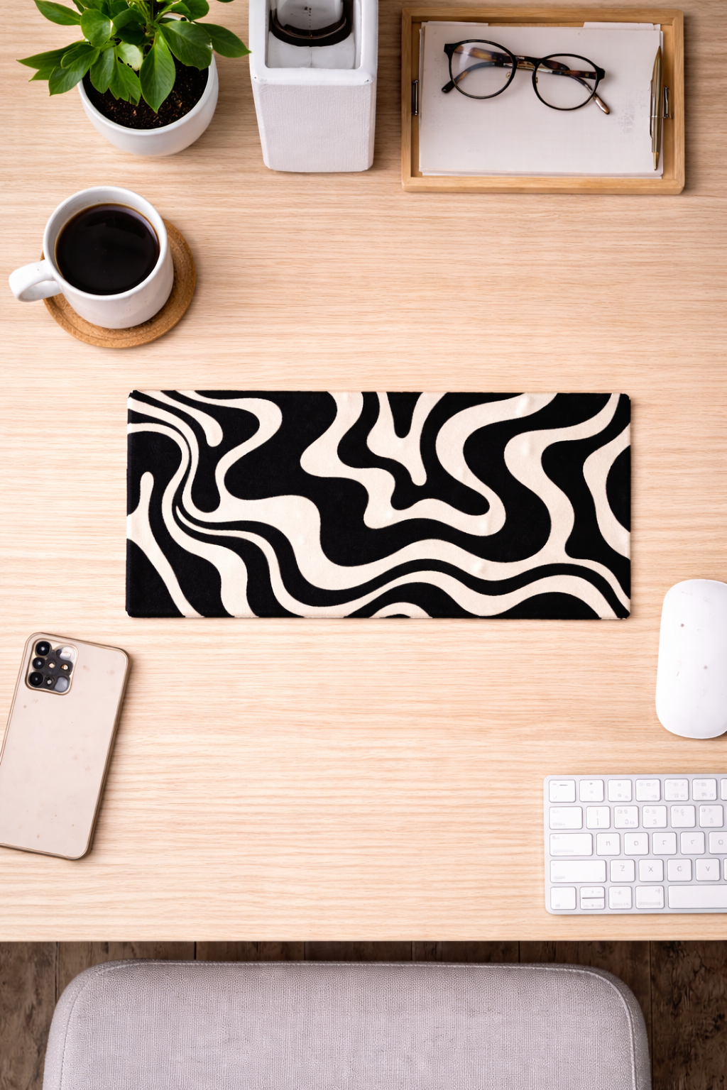 The tide-inspired design and deep black tones make this rug easy to style with modern interiors, gaming setups, and minimal desk arrangements. It pairs well with keyboards, laptops, desk lamps, and clean workspace setups.